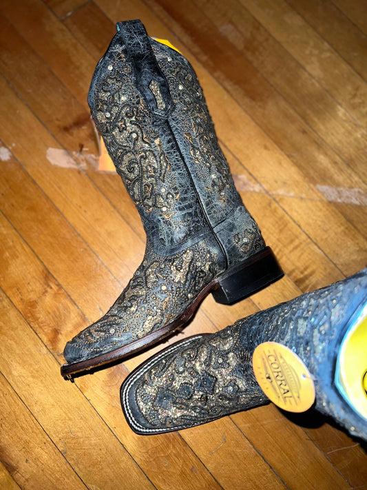 The Jayda snip toe Corral Gray/Black Crackle Inlay Studs & Crystals
