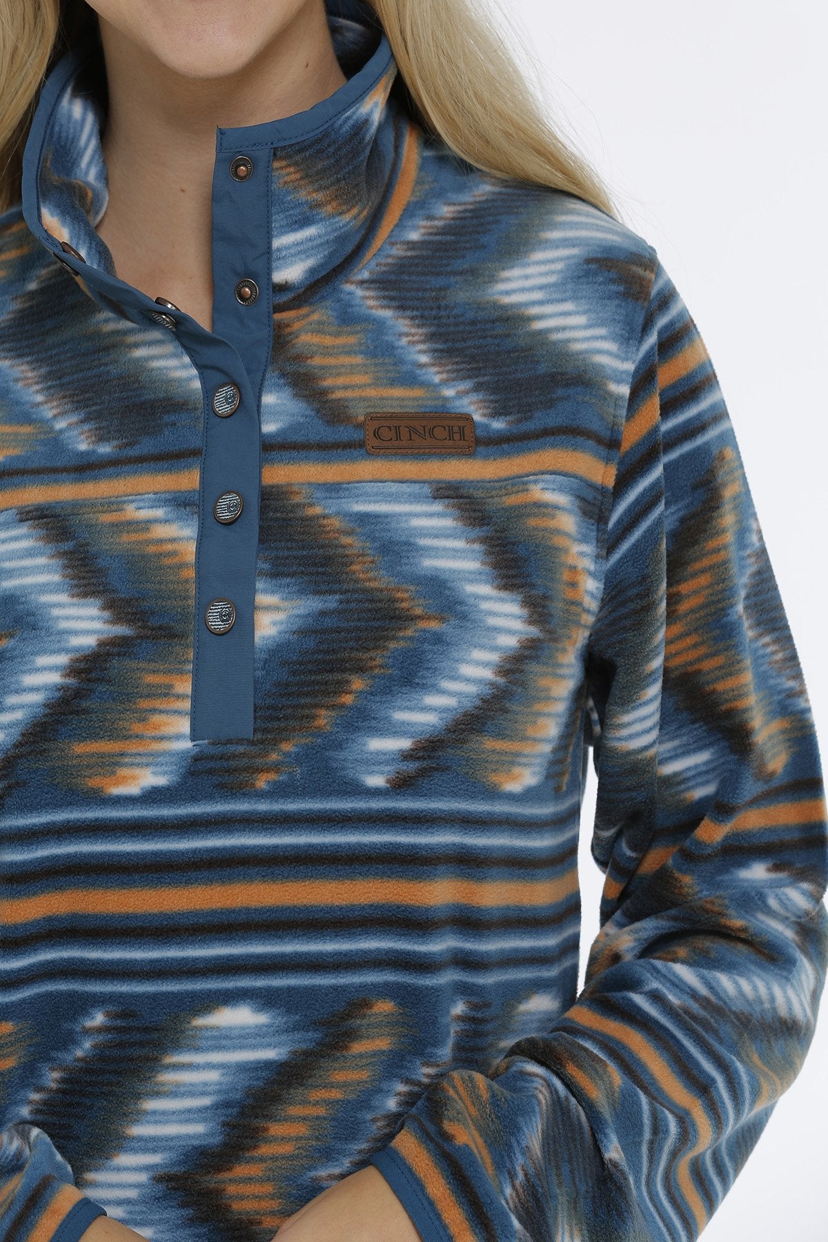 This eye-catching teal printed polar fleece pullover is the versatile outerwear choice you need for everyday layering. Crafted in poly-spandex to ensure comfort and ease of movement both in and out of the saddle, design details include a snap placket, dual hand pockets and a faux leather CINCH logo patch.