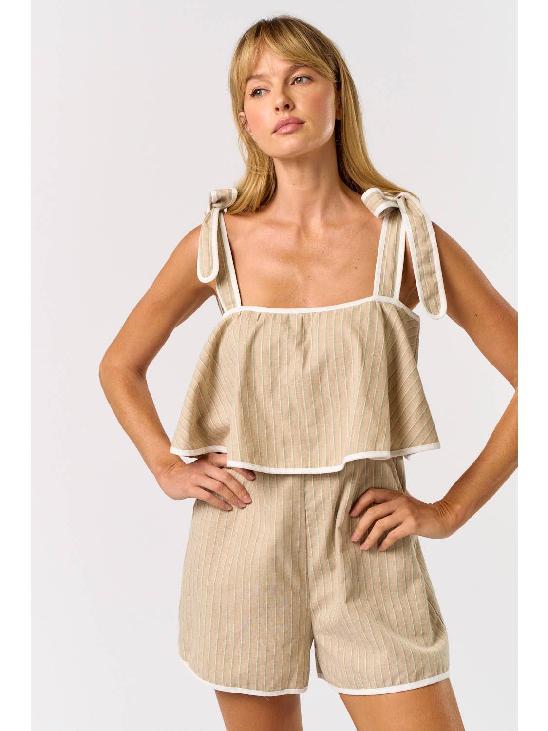 Shoulder bow tie romper -Back zip -Shoulder bow tie detail -Contrast hem -All over stripe pattern 80% cotton 20% linen