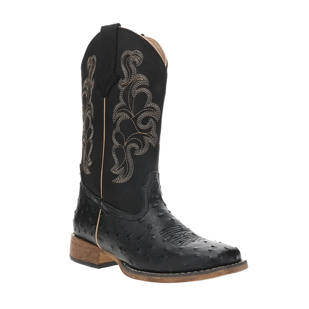 - Black ostrich-printed faux leather vamp, faux leather shaft with western stitch design