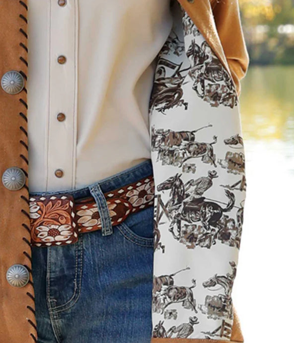 - Solid brown with black whip stitch details on collar, placket, cuffs, pocket, and yokes