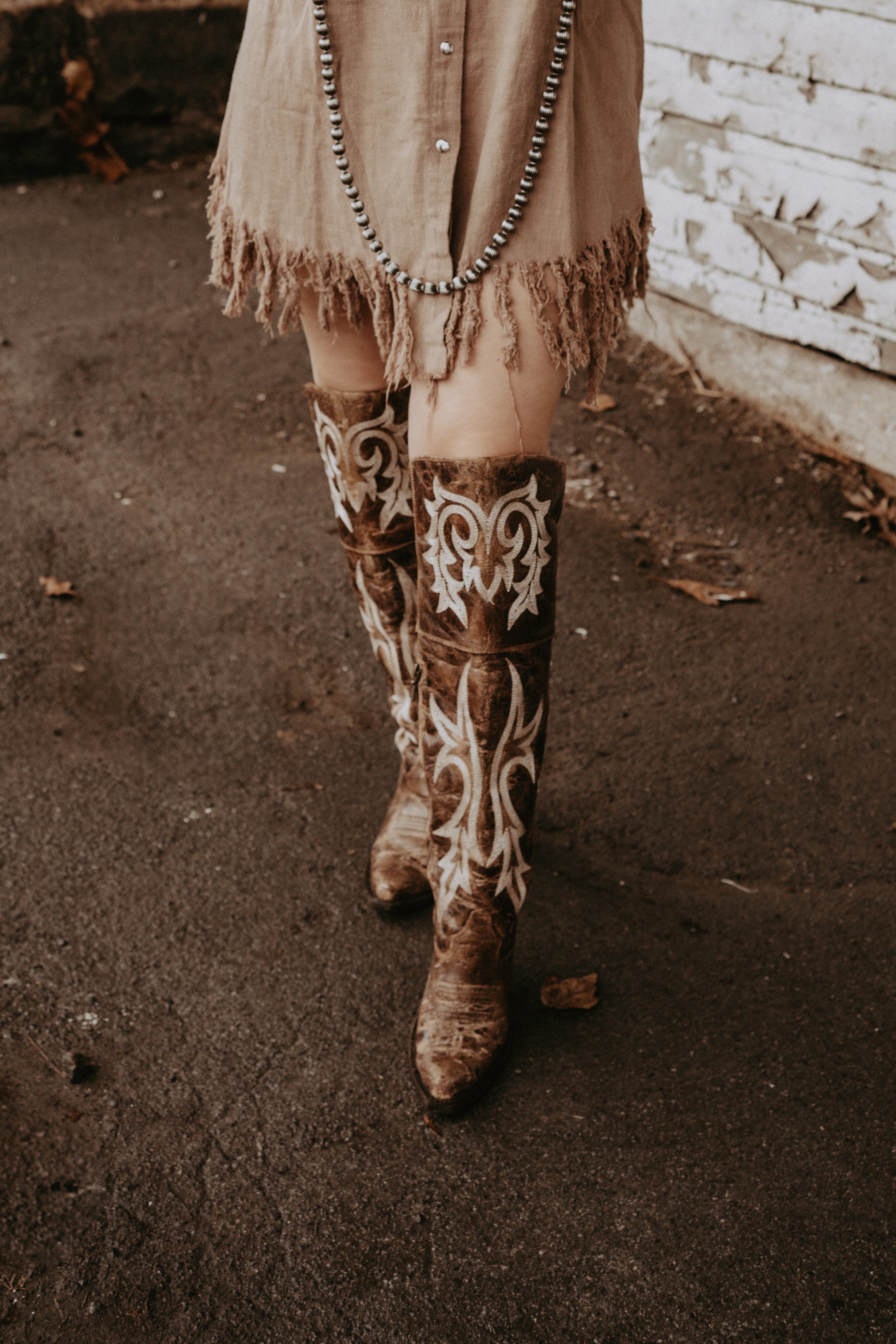 The Jilted boot is a show stopper with an over-the-knee, 20 height. Handcrafted with soft, distressed leather and western stitching throughout. It's dressed up with a high fashion heel, snip toe and leather outsole. An inside zipper makes it easy to step in and go.