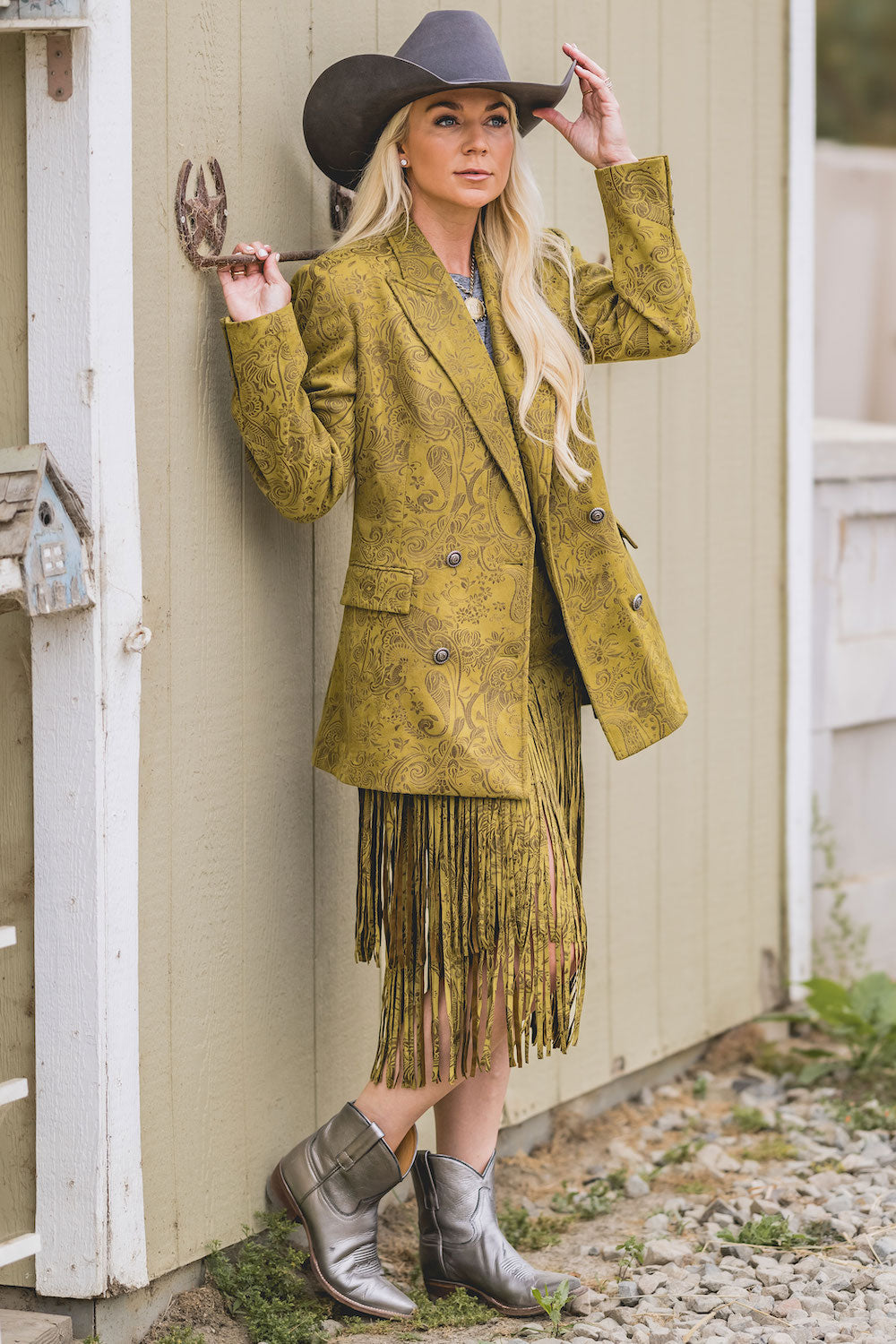 This fun and flirty skirt features three tiers of fringe, making it a bold statement piece. Crafted from luxurious embossed suede in a stunning Sagebrush colorway, It’s perfect for adding a unique touch to your wardrobe. Pair it with the Trailblazer jacket or style it your way for an effortlessly chic look! I love the flair of fringe added to an outfit and I hope you do too!