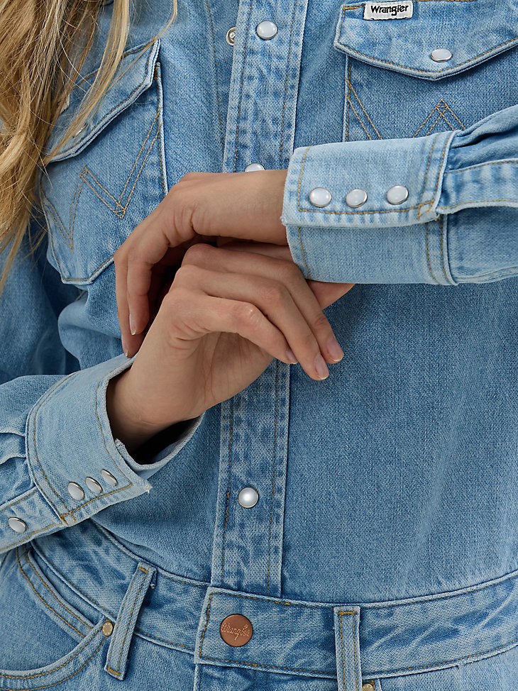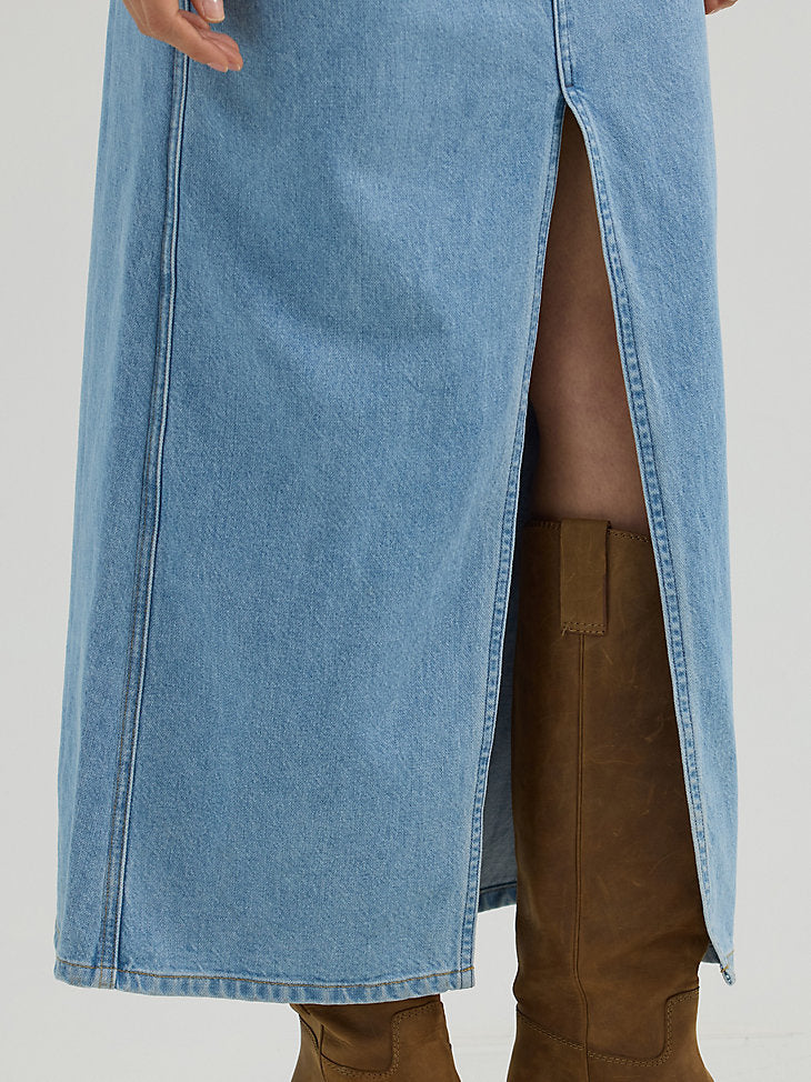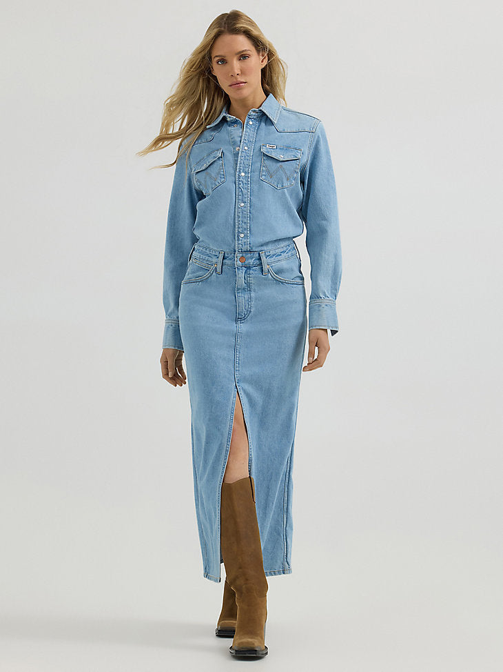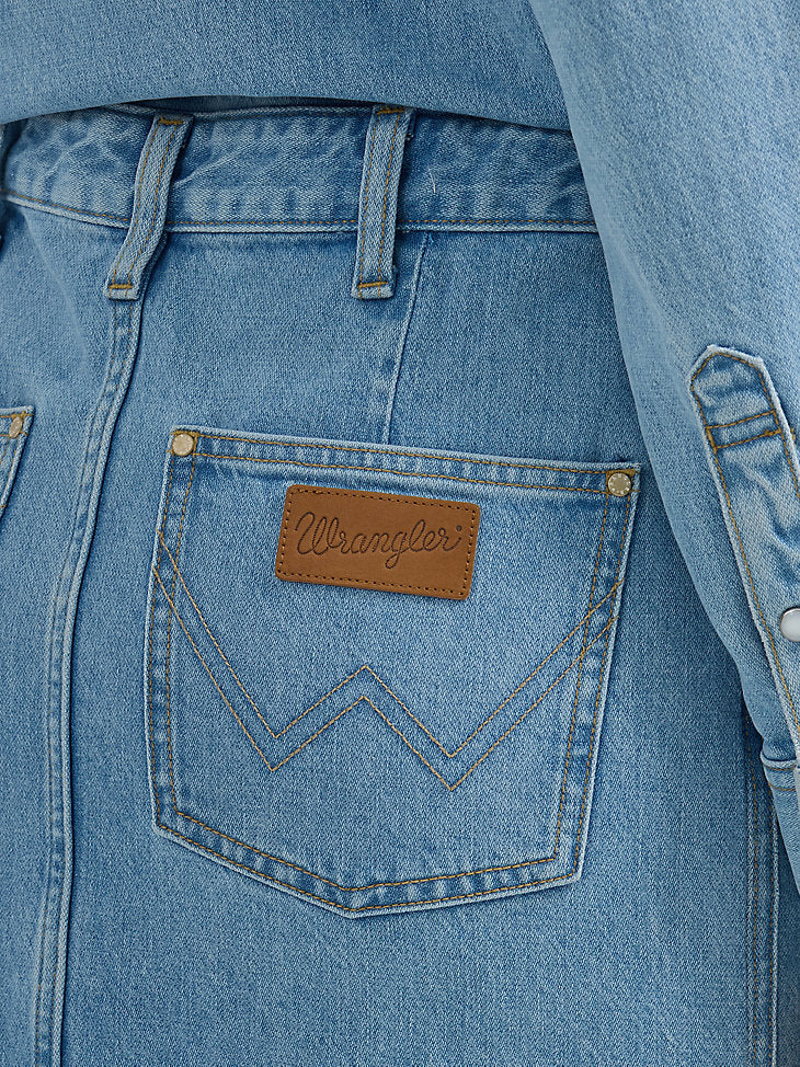 Transitioning between seasons is as easy as can be with our Women’s Denim Maxi Dress. Cut in a maxi length, this one-and-done denim outfit comes with tons of feminine details. On top, it has the look and feel of a classic Western-inspired snap shirt, complete with pointed yokes, chest pockets, the signature “W embroidery, and pearl snaps. On the bottom, the same flattering fit of your favorite jeans but in skirt form with a slit in front for easy movement and five-pocket styling. Plus, this denim dress is crafted from cotton, so it’ll mold to you over time.