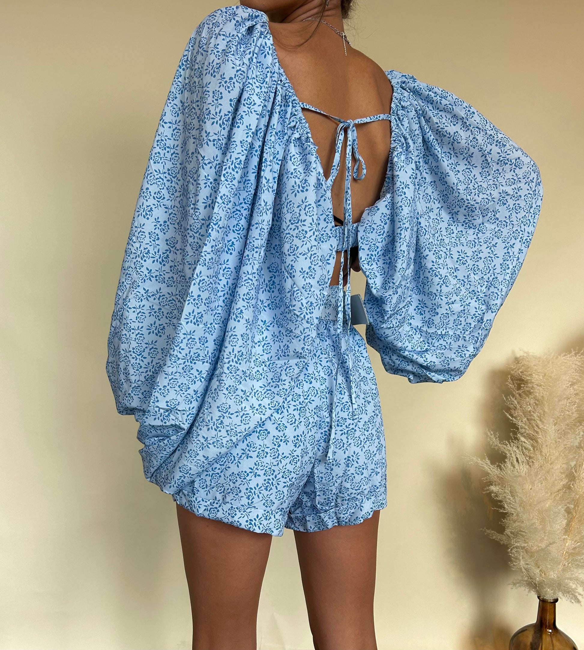 Flowy set with a statement sleeve and shorts.