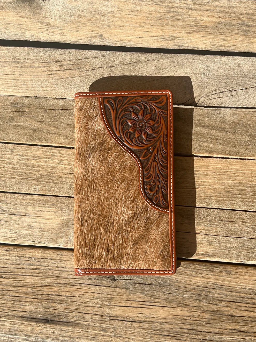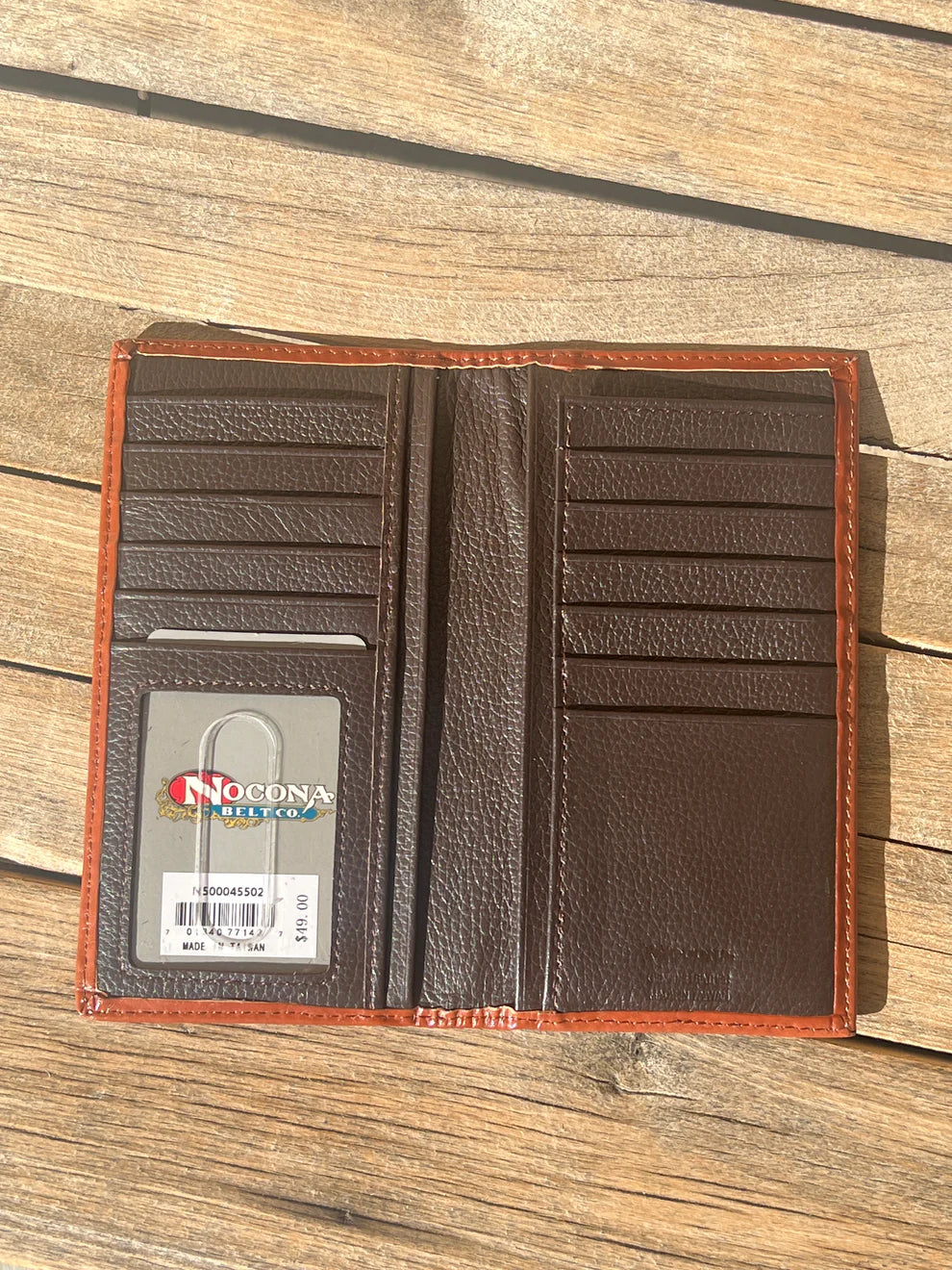 Nocona always brings you high quality leather goods with the western style that you crave. This wallet is tan embossed with royal inlay. Features include checkbook holder 11 card slots one see-through card slot additional card/photo slot insert slim fit design and top grain leather throughout