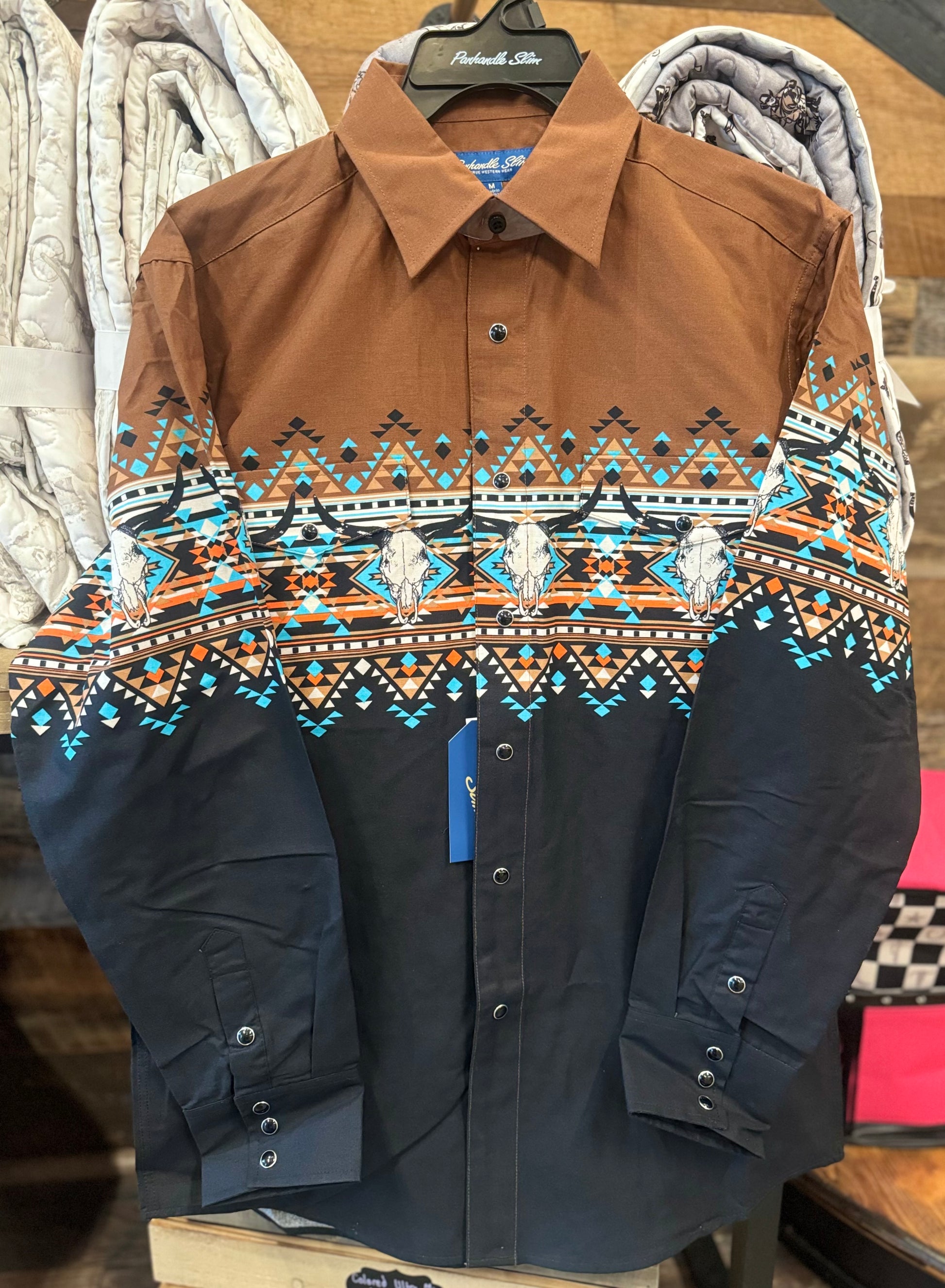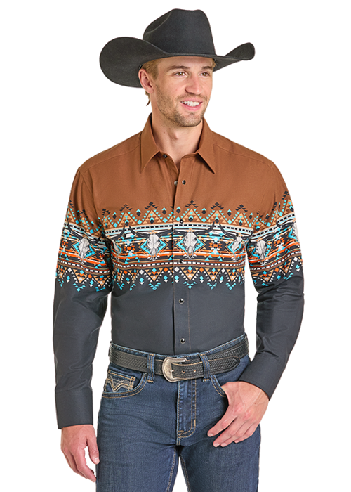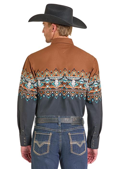 Be comfortable with the new arrival of R&R Mark's Aztec & Skull Border Shirt with the Long Sleeve Snap Up
