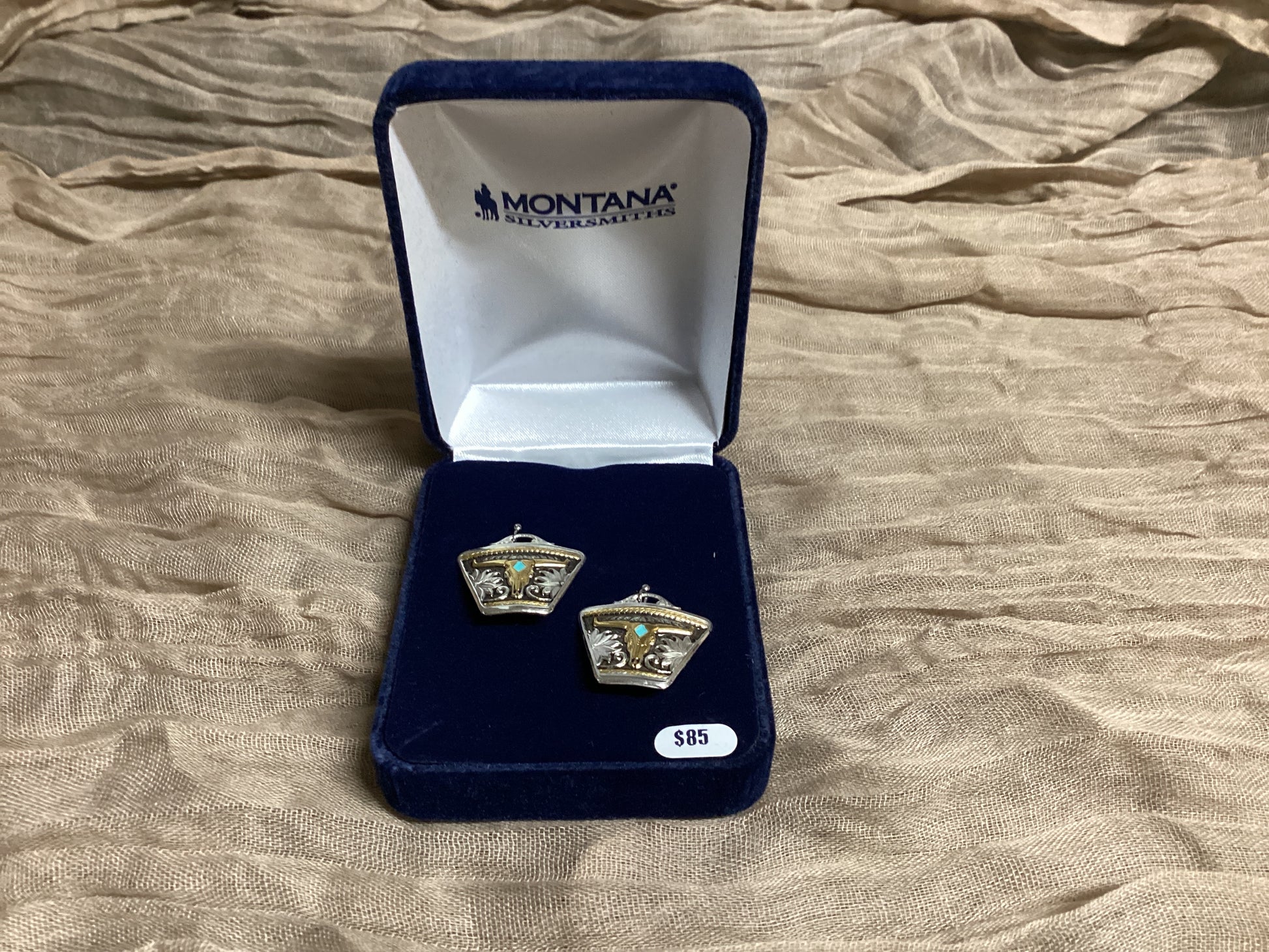 99.9% fine silver and yellow gold over a brass base. Montana Armor to prevent tarnish. Paint. Stainless steel French wire.