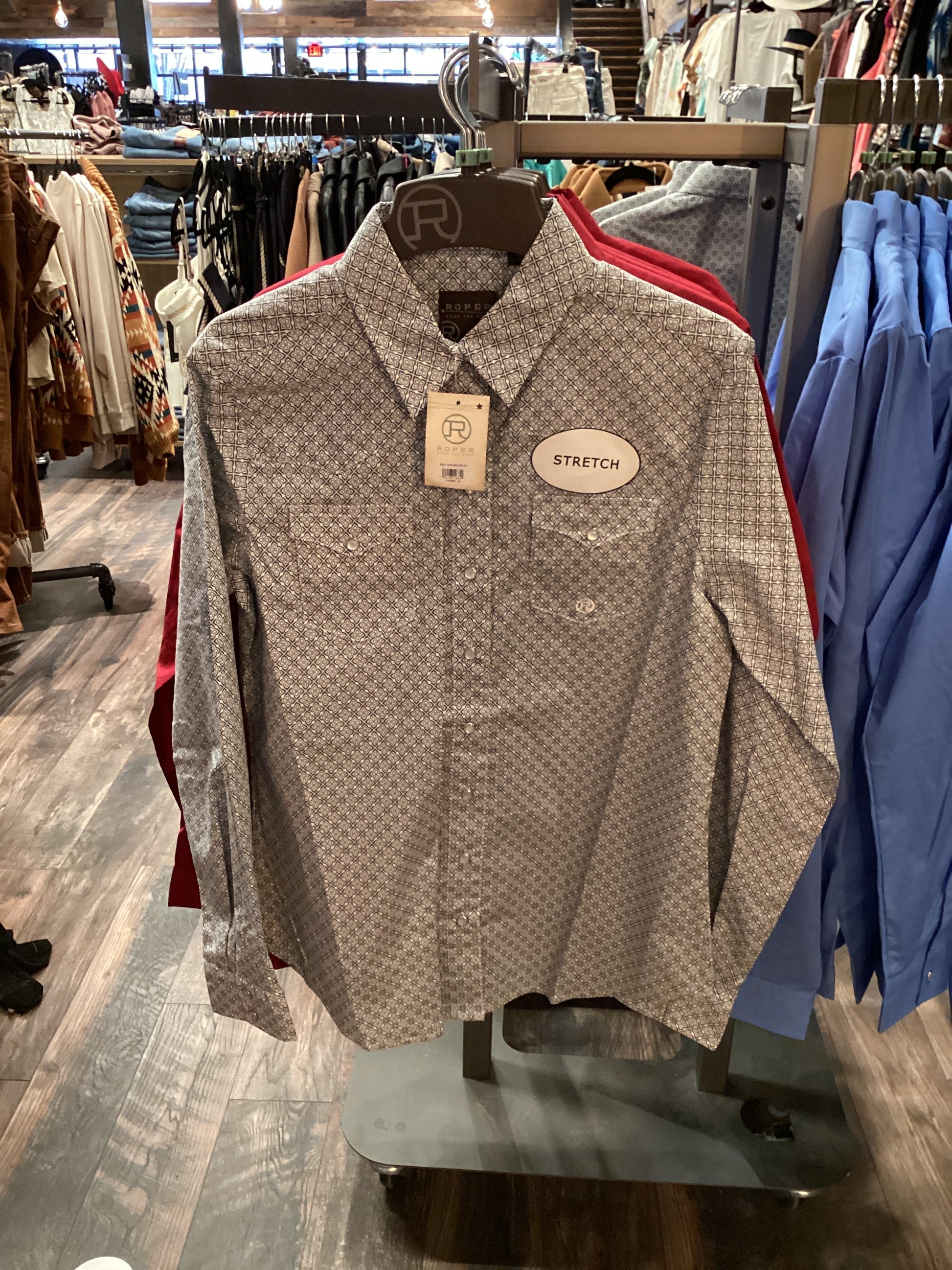 Roper Women's Long Sleeve Amarillo Allover Print Stretch Four Point Foulard Grey Snap Up