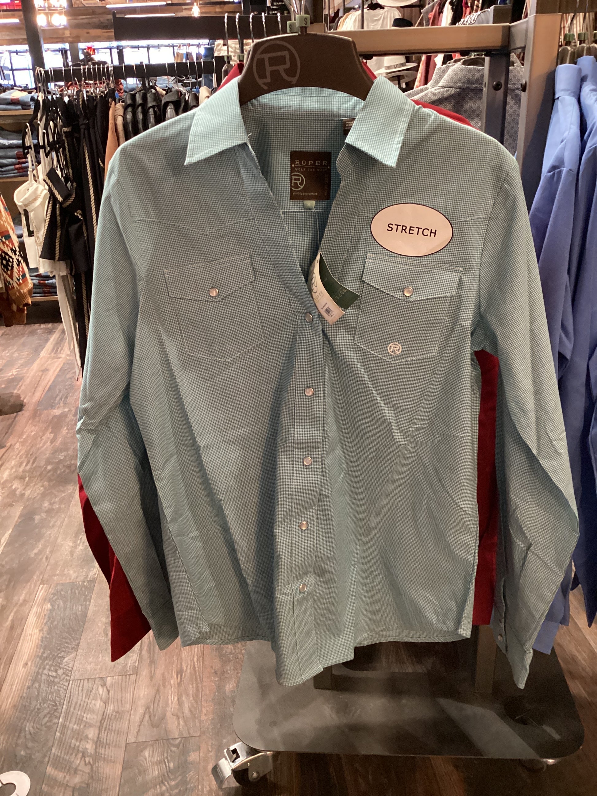 Roper Women's Long Sleeve Amarillo Plaid Stretch Minicheck Turquoise Snap Up