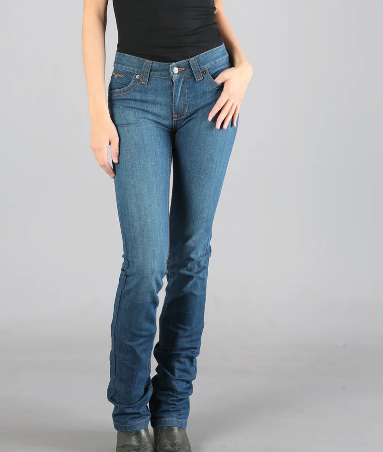 Fit: Mid-Rise, Fitted Thigh, Modest Bootcut