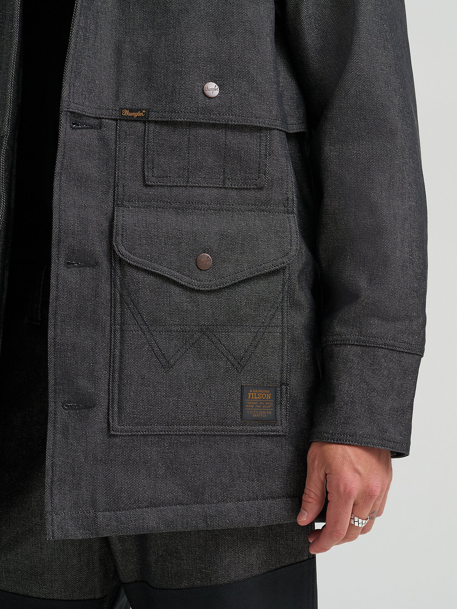 Rugged wear made even bolder than before—meet the Filson® x Wrangler® Indigo Packer Jacket. Pulled right from archives, this warm coat offers all the pocket space and proportions you need to dominate colder days. It features a special-edition denim exterior and Filson’s signature, densely woven Mackinaw wool lining, topped off with a sheepskin-shearling shawl collar to withstand wild temperature swings. It’s all in the details, too: a leather strap at the collar, the ‘W’ pocket stitching, a locker loop at the neck, slotted utility pockets, branded hardware, and collaboration labels. Plus, its caped construction delivers double-layer protection over the shoulders and arms.