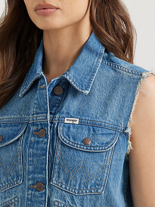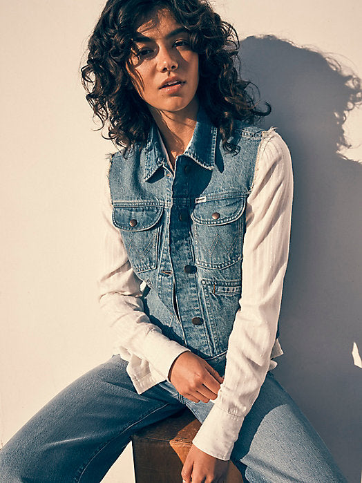 A good vest is hard to find. With a snug silhouette that's easy to style, we’ve got just the one for you with the Wrangler® Shrunken Denim Vest. With side welt pockets and branded buttons down the front, this feminine vest adds a vintage vibe to every look. Made from 100% cotton, this vest is here for the long haul.